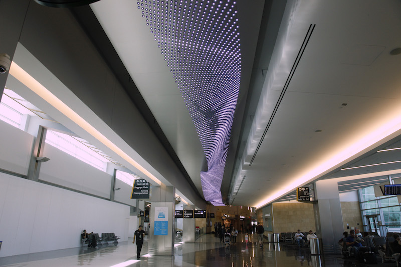 Travelers see a ribbon of light comprised of 38,000 suspended LED pendants as they exit the checkpoint—a time when they are overwhelmed and asking themselves all of the stressful traveling questions: ‘How do I find my gate? I need to find something to eat. How much time do I have until I board?”