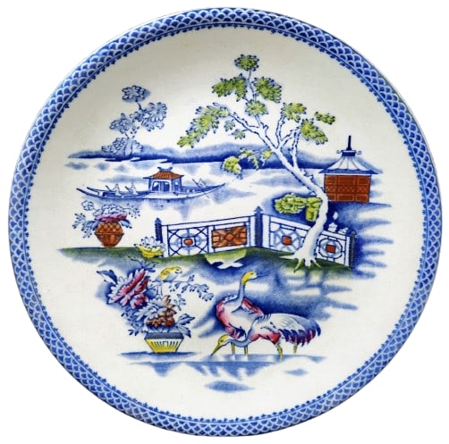 Plate, 9.5 inches diameter. Blue transfer with polychrome clobbering. Printed maker's mark for Thomas Till & Sons. This tableau features a foreground of two cranes standing in the water next to a large vase of peonies with a songbird perched in the blooms. In the middle ground is a bent tree in front of a lattice fence and another pot of peonies to the left. The background is composed of a body of water with a small structure on the shore at the right, couple of sampan boats on the left, and a tree on the far shoreline behind. The border consists of a band of scallops.