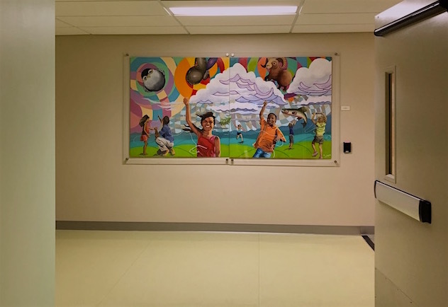 Kelsey Sletto's playful and bright mural greets you as you walk through a hospital hallway.