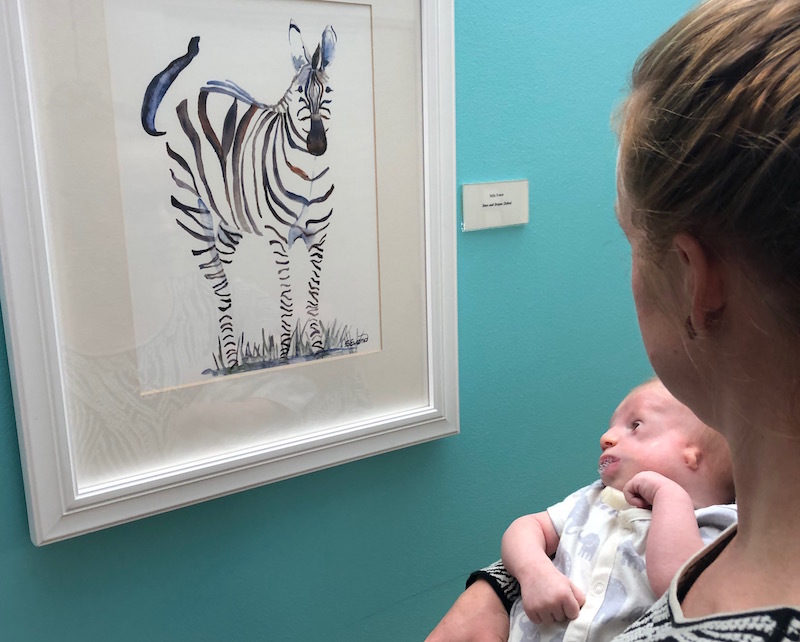 Odin taking in the high contrast of Sally Evan's watercolor painting, "Stars & Stripes," at Children's Hospital Colorado.