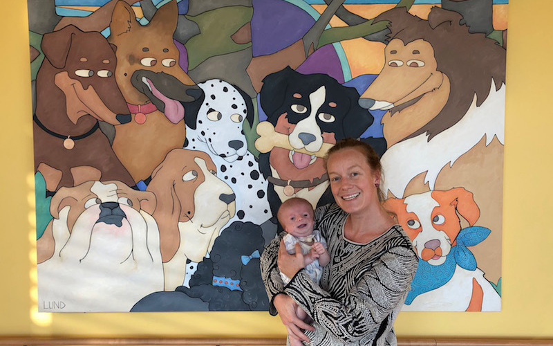 Me and my son Odin in front of Jilian Lund's "Canine Candy" at Children's Hospital Colorado.