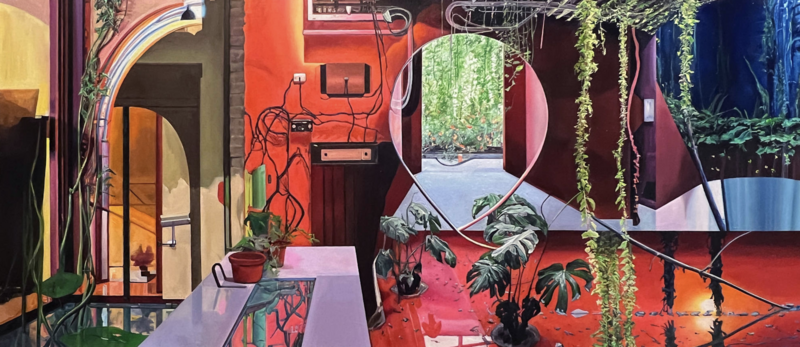 Her compositions are layered and labyrinthine, shaped by recurring visual motifs (spheres, light rays, towers, and bars) all tied to personal significance. These forms show up across her work like familiar markers, creating a visual rhythm that ties everything together.