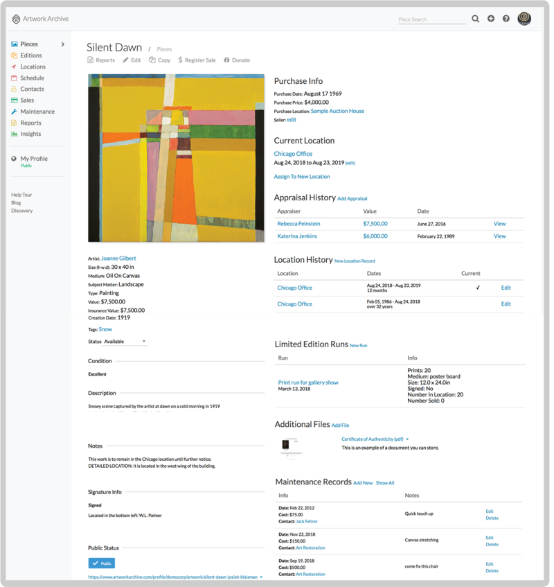 You’ll be so glad you took the time to do it. When you’re done you’ll have a living archive in Artwork Archive—tracking every single piece you’ve owned, where it has lived, all of your contacts, financial documents, appraisals and more.