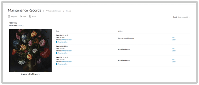 With all of your information in one place, you can easily generate comprehensive reports for your insurance company, accountant, estate planner, and/or supervising board. Stop searching through hard drive folders, or even manila folders in a filing cabinet. Free up hours by creating an inventory list with the history and financial details for each piece, and have that report ready when insuring a work or planning a loan.