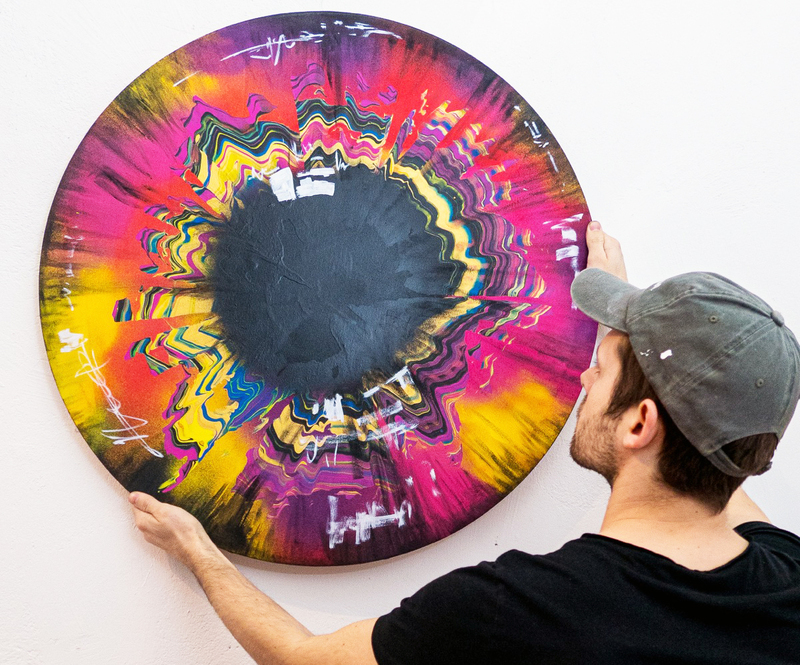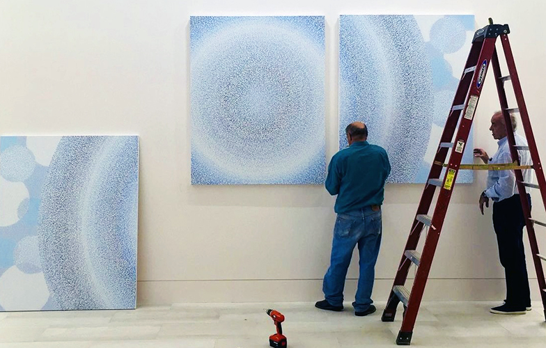 Paintings by AJ Oishi being installed at an art fair in Miami.