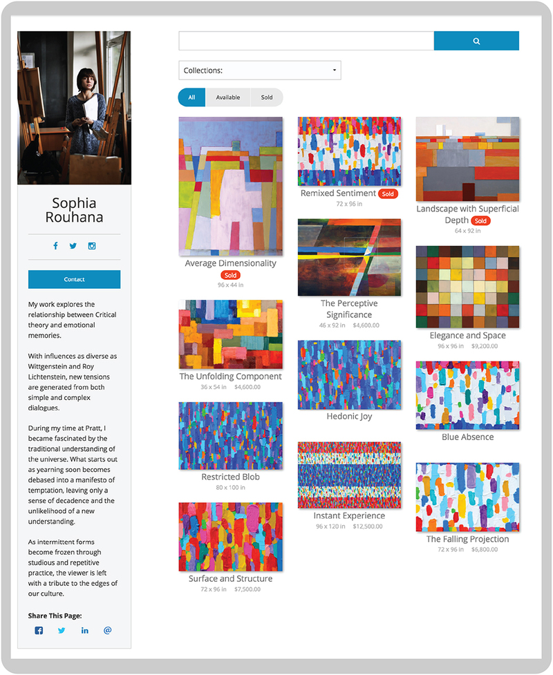Once you’ve inventoried all your work, you can either view it all on the Pieces Page or turn on your Public Page and peruse a beautiful online gallery of your work. Then you can share it with buyers and collectors and sell more artwork. Our paid subscribers who have marked four or more pieces “public” are featured on Discovery, where buyers can contact them directly to purchase work. Better yet, artists handle the transactions and keep all the money!