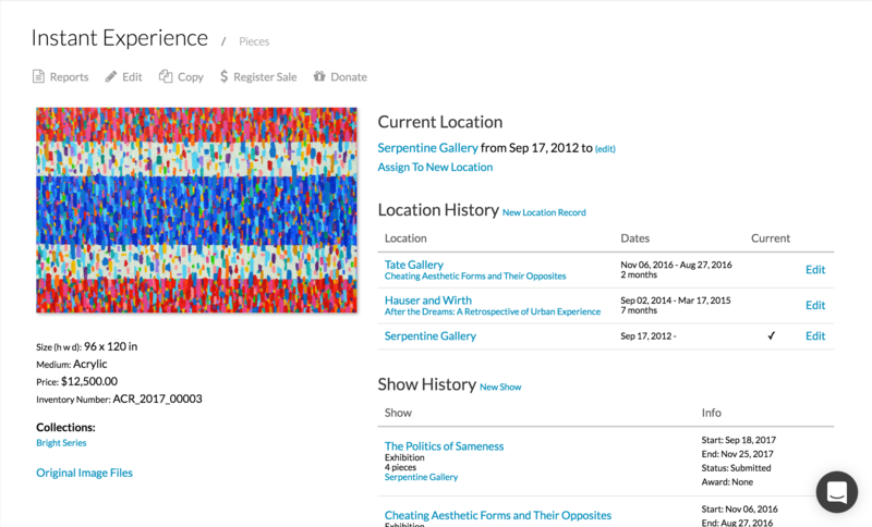 Once you’ve logged all your Pieces into the art inventory software you can assign each piece to a location. That way you’ll always know which gallery or venue is showing your work.
