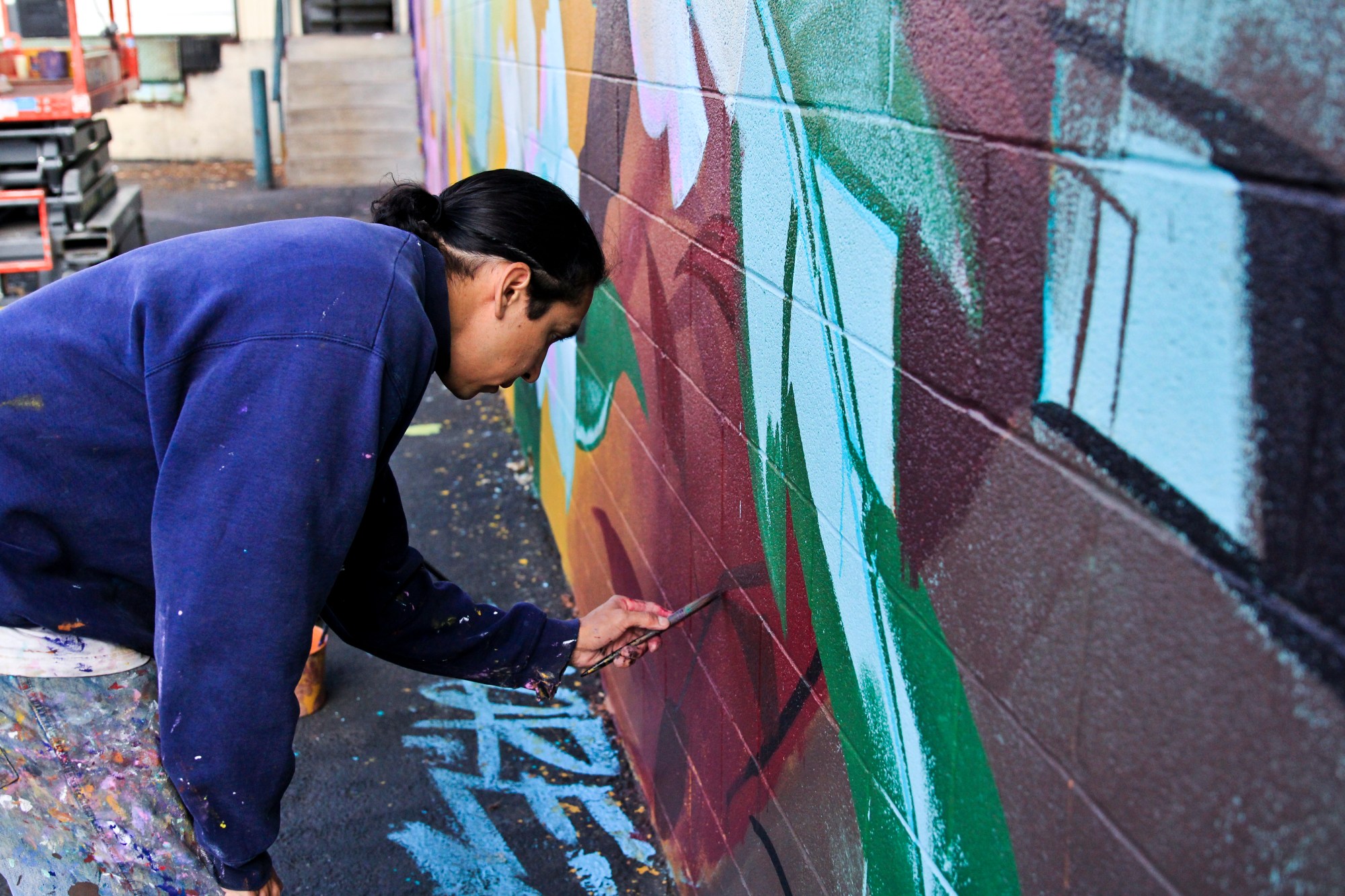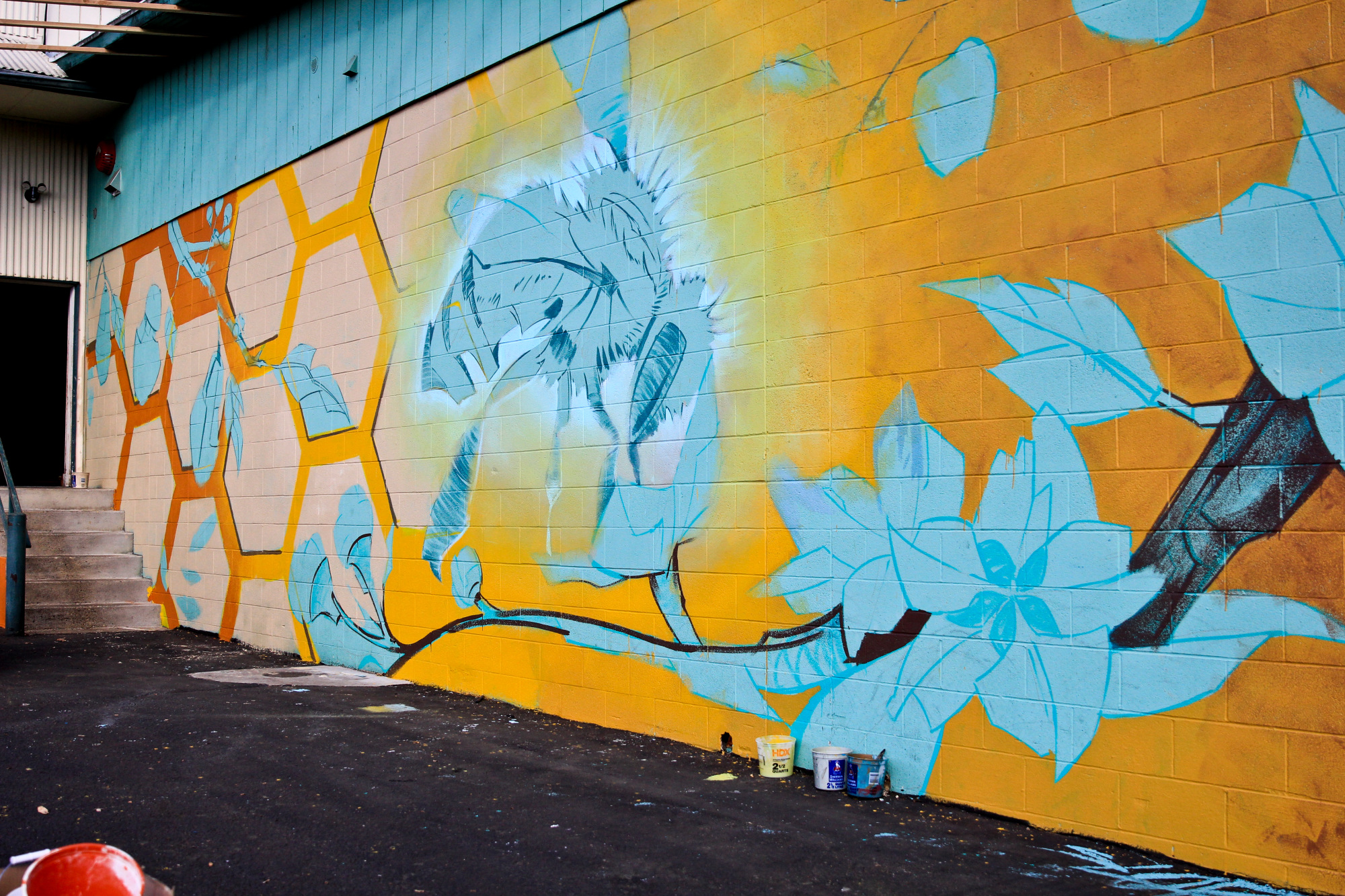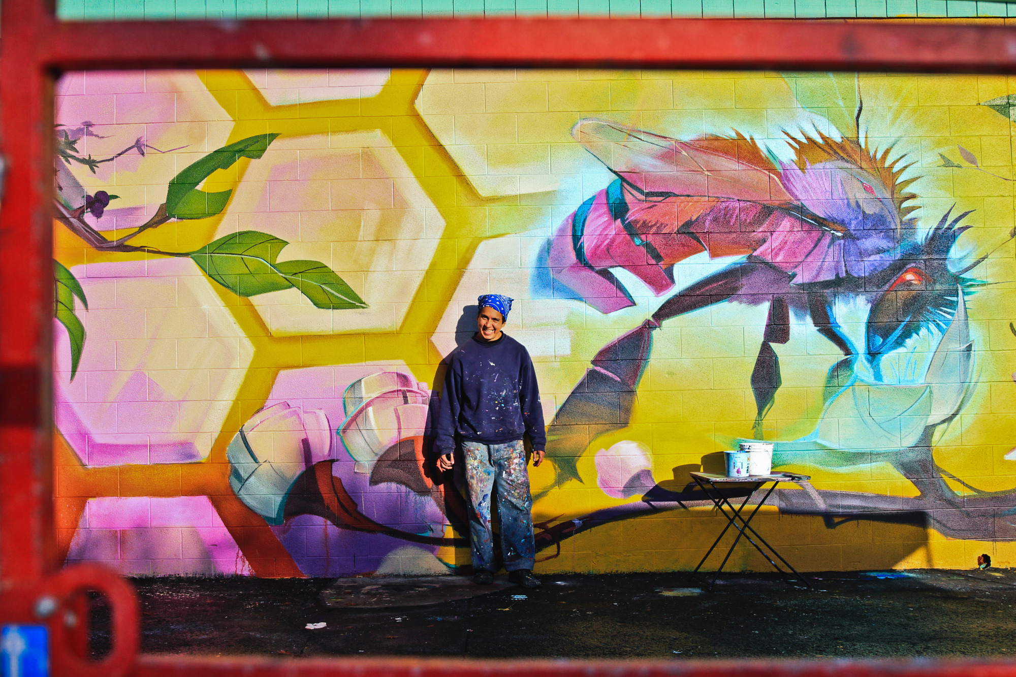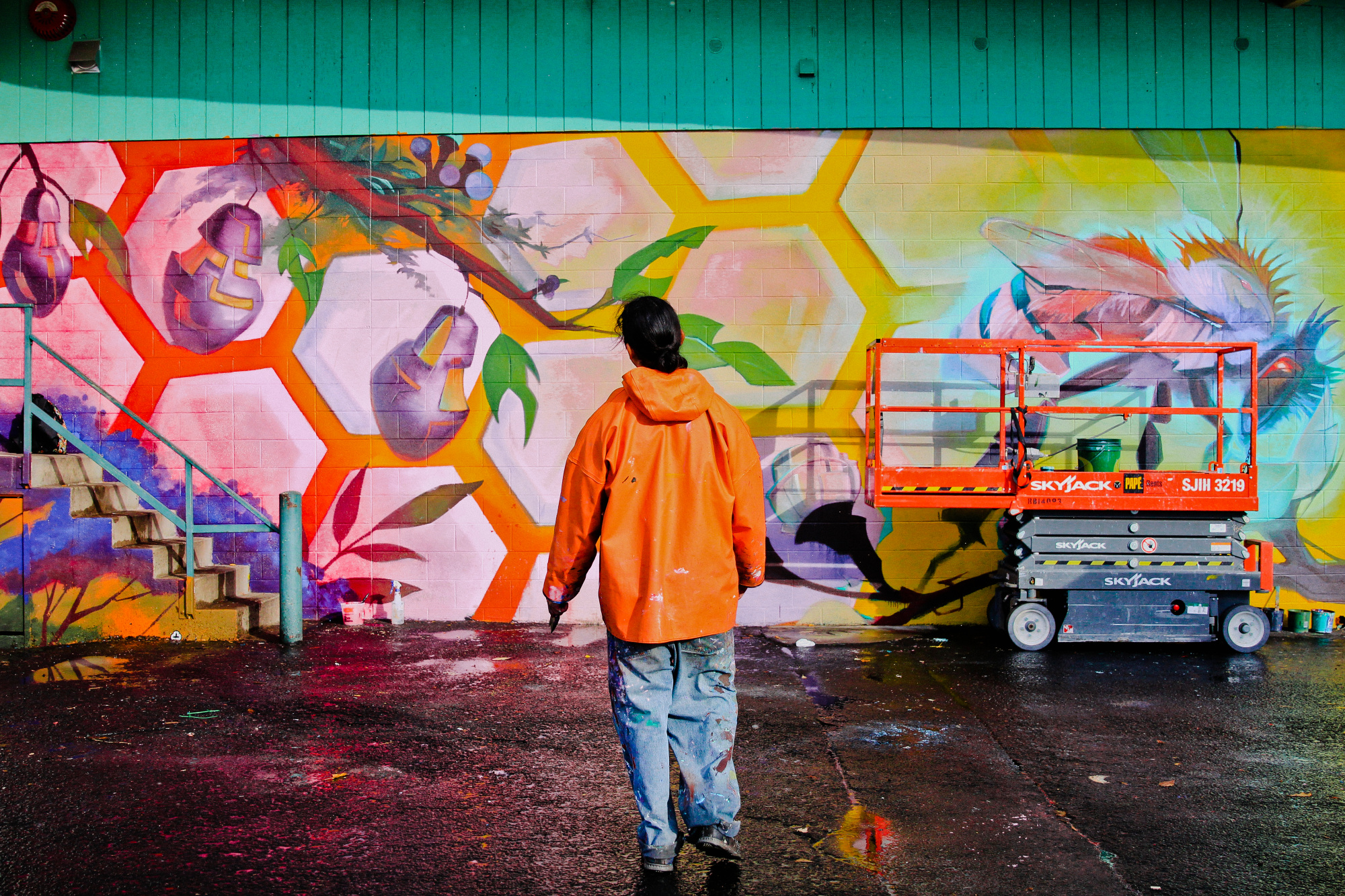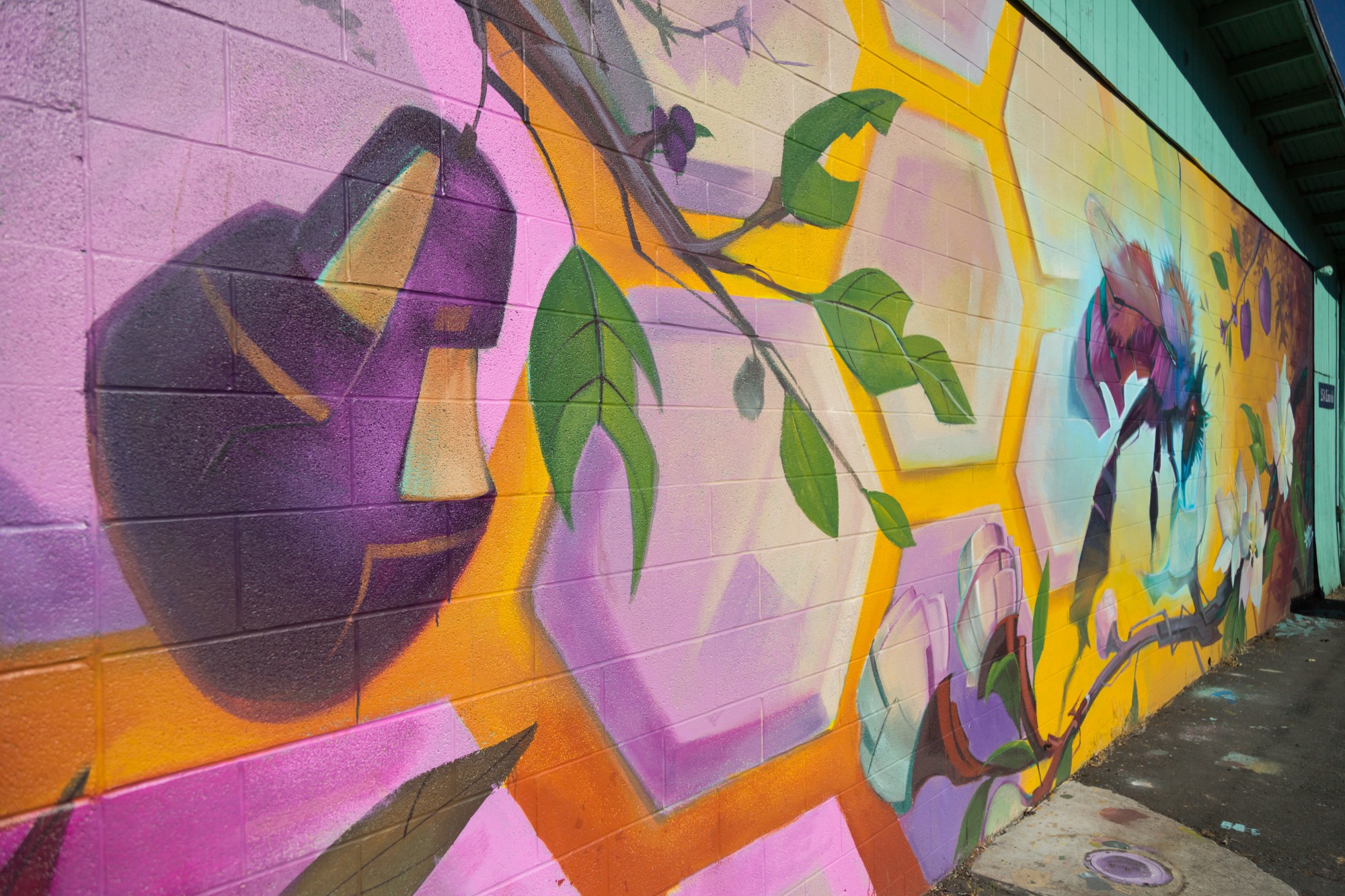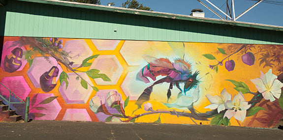 The University of Oregon graduate came back to his college town to paint the wall and provide a subtle environmental message in the process. The bee and the honeycomb help remind viewers the important role bees play in cross-pollination. Without it, the fruit that is used to make things like WildCraft’s cider would be much more difficult to grow.