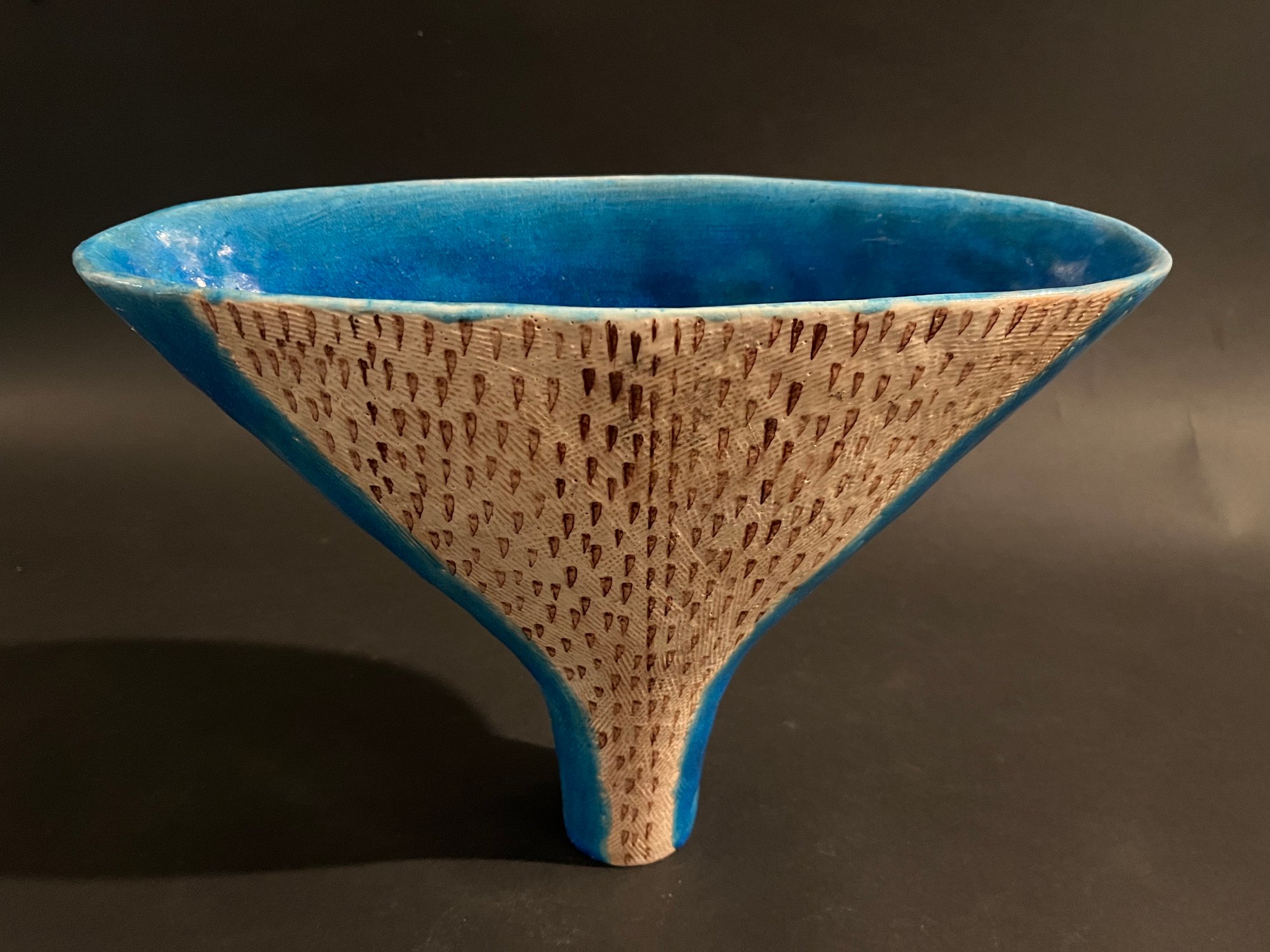 Mid-20th century triangular turquoise ceramic ikebana vase on a tall foot. The front surface features a textured geometric pattern of brown drop motifs on a beige background.