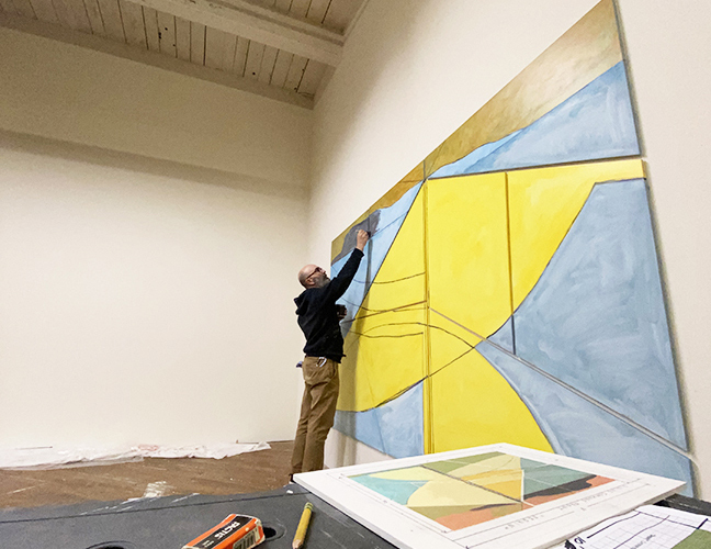 Paintings by AJ Oishi being installed at an art fair in Miami.